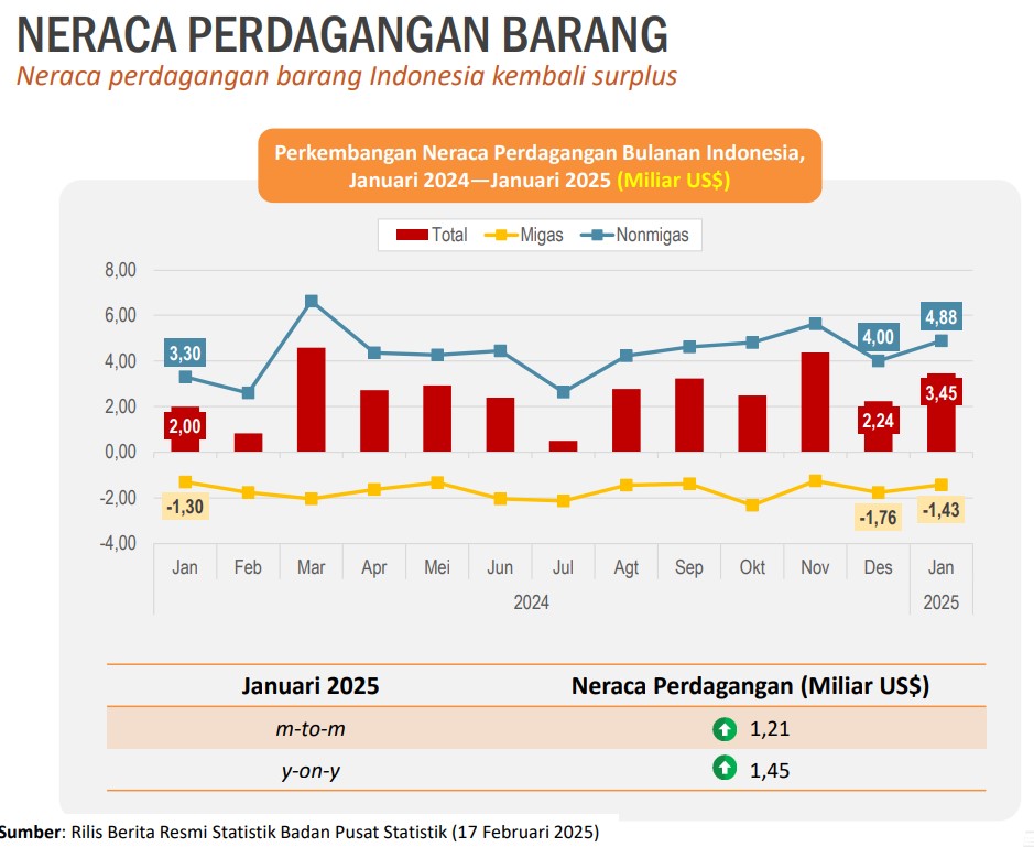Di mana neraca perdagangan bulan Desember 2024 2,24 Milyar USD sedangkan Januari 2025 neraca perdagangan menjadi 3,45 milyar USD. Sementara neraca perdagangan Januari 2024 sebesar 2 milyar USD naik 1,45 milyar USD pada Januari 2025.