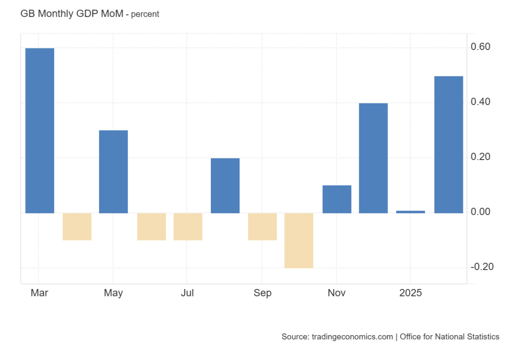 ONS melaporkan ekonomi Inggris sebesar 0,5% bulan ke bulan pada Februari 2025, melampaui ekspektasi kenaikan sebesar 0,1% setelah mengalami penurunan pada Januari.