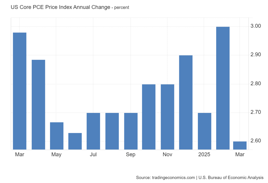 Indeks harga inti PCE di AS, yang tidak termasuk harga yang bergejolak dan harga energi dan merupakan tolok ukur inflasi dasar yang dipilih Federal Reserve dalam ekonomi AS, tidak berubah dari bulan sebelumnya pada bulan Maret 2025. Dari tahun sebelumnya, indeks mencapai 2,6%, melambat dari lonjakan 3% pada bulan Februari, kenaikan paling lemah sejak Maret 2021.