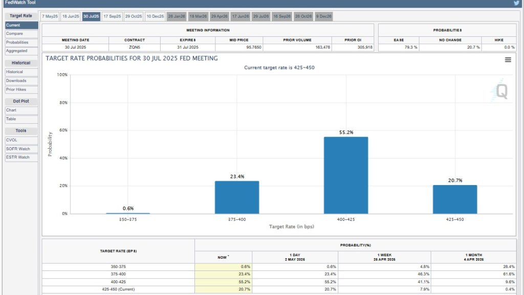 Namun penurunan suku bunga diperkirakan akan terjadi pada bulan Juli, dimana probabilitas The Fed mempertahankan suku bunga mencapai 20,7%, sedangkan probabilitas penurunan suku bunga dalam kisaran 3,75–4,00 mencapai 34%. Untuk probablitas penurunan suku bunga dalam kisaran 4-4,25 mencapai 55,2%.