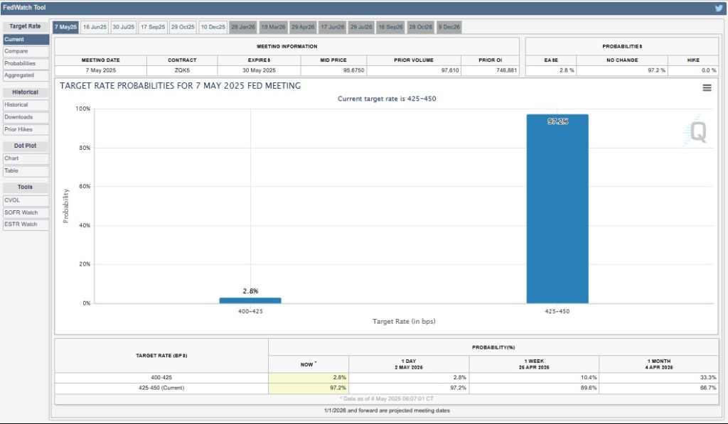 Jika dilihat dari pengukuran CME Fed Watch Tools, maka untuk pertemuan The Fed berikutnya tanggal 7-8 Mei 2025, probabilitas The Fed mempertahankan suku bunga masih tinggi mencapai 97,2%, sedangkan probabilitas penurunan suku bunga mencapai 2,8%.