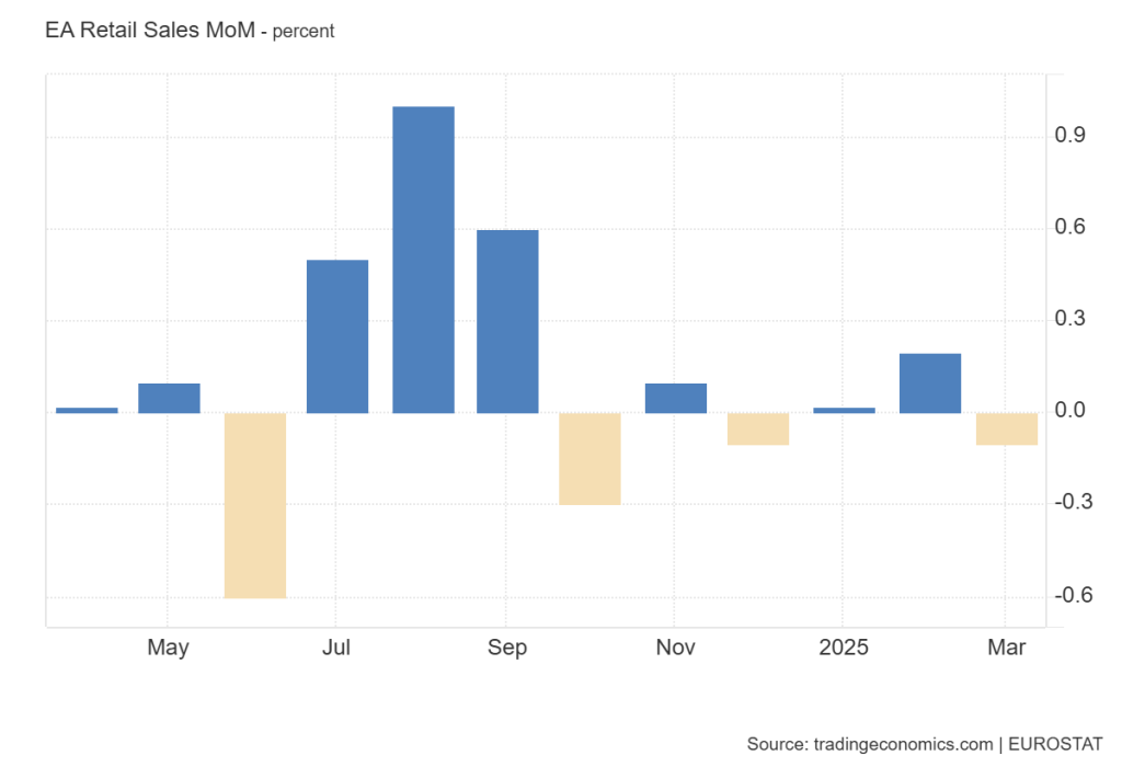 (Vibiznews – Economy & Business) Penjualan eceran Zona Euro berkontraksi, turun -0,1% dari bulan ke bulan pada Maret 2025, di bawah kenaikan 0,2% yang direvisi turun pada Februari dan gagal memenuhi ekspektasi pasar untuk pertumbuhan yang datar.