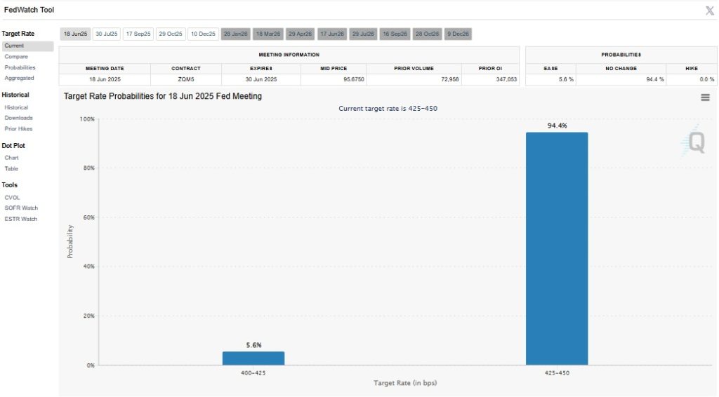 Berdasarkan data CME FedWatch, probabilitas untuk The Fed mempertahankan suku bunga pada pertemuan The Fed tanggal 18 Juni 2025 adalah 94,4%.