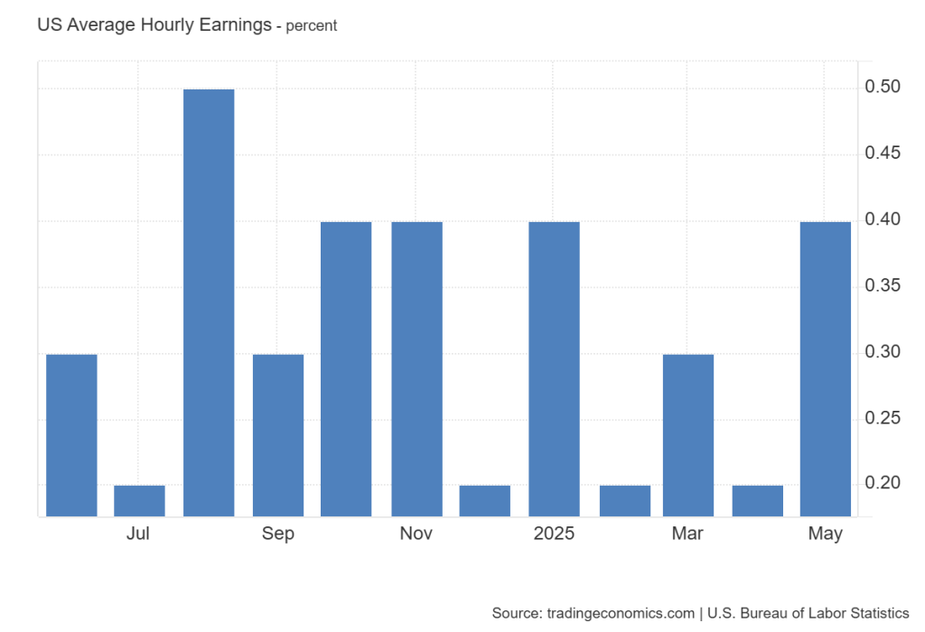 Sedangkan pendapatan per jam rata-rata untuk semua karyawan di sektor swasta nonpertanian AS naik 0,4%, pada Mei 2025, naik dari kenaikan 0,2% pada April dan mengalahkan perkiraan pasar sebesar 0,3%.