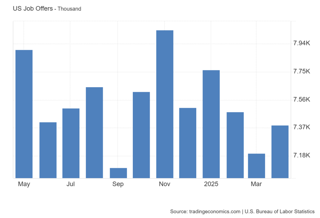 Data JOLTs Job Openings, yang merupakan data lowongan pekerjaan di Amerika Serikat meningkat sebanyak 191.000 menjadi 7,391 juta pada bulan April 2025, di atas ekspektasi pasar sebesar 7,10 juta.