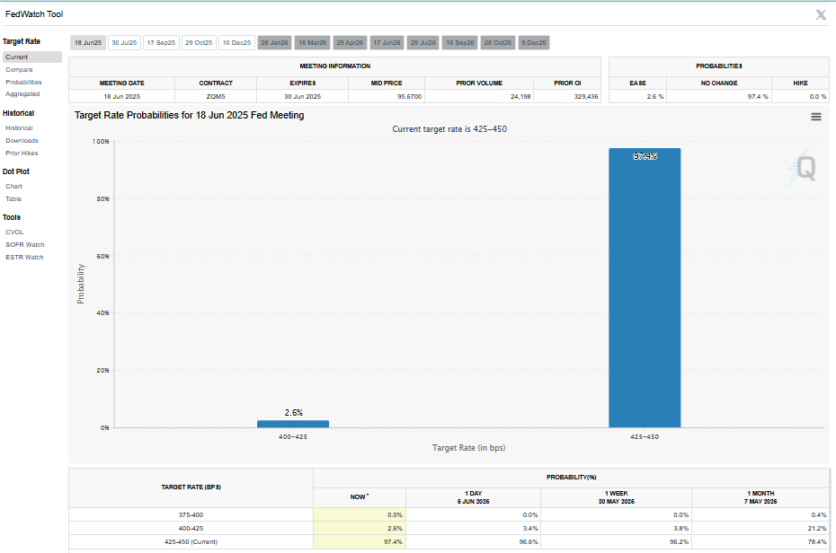 Jika dilihat dari pengukuran CME Fed Watch Tools, setelah rilis data tenaga kerja akhir pekan ini dan mencermati pernyataan pejabat Fed, maka untuk pertemuan The Fed berikutnya tanggal 18 Juni 2025, probabilitas The Fed mempertahankan suku bunga saat ini mencapai 97,4%, sedangkan probabilitas penurunan suku bunga mencapai 2,6%.