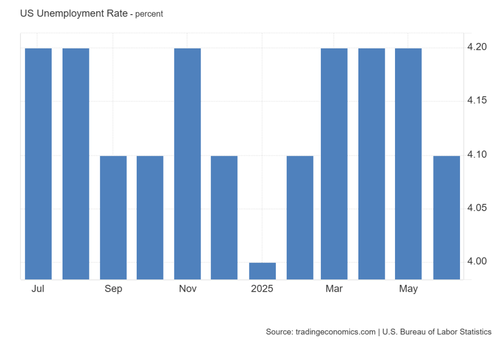 Sedangkan tingkat pengangguran AS bulan Juni melambat menjadi 4,1%, lebih rendah dari perkiraan sebesar 4,3%. Angka tersebut lebih rendah dari 4,2% pada bulan Mei.