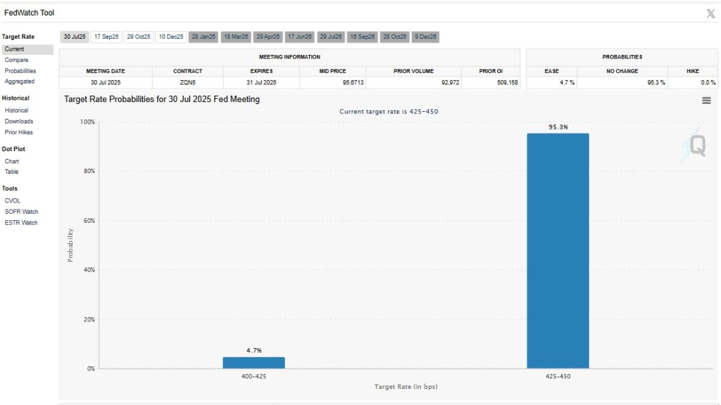 Jika dilihat dari pengukuran CME Fed Watch Tools, maka untuk pertemuan The Fed berikutnya tanggal 30 Juli 2025, terlihat probabilitas The Fed mempertahankan suku bunga mencapai 95,3%, sedangkan probabilitas penurunan suku bunga mencapai 4,7%.
