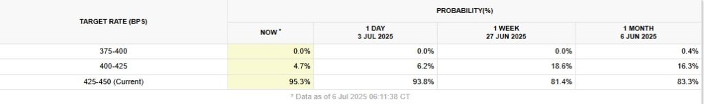 Jika dilihat pada bulan lalu pada 6 Juni 2025, terjadi peningkatan The Fed mempertahankan suku bunga dari 83,3% menjadi 95,3% pada 6 Juli 2025.