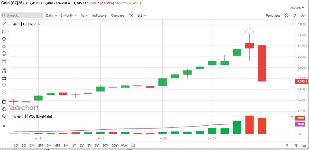 Harga emas berjangka AS kontrak April 2026 mengalami koreksi tajam pada 31 Januari 2026 sebesar 11,39%, demikian juga harga emas spot anjlok 8,91%, setelah Presiden AS Donald Trump menetapkan kandidat ketua Fed yang hawkish sehingga menguatkan dolar AS dan menekan harga emas.