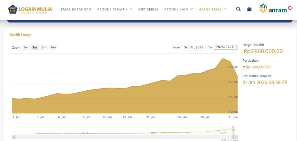 Selama bulan Januari 2026 harga emas antam menguat. Pada 1 Januari 2026 harga emas antam mencapai Rp2.448.000/gram, dan pada 31 Januari 2026 harga emas antam mencapai Rp2.860.000. Terjadi kenaikan sebesar 15% atau Rp372.000/gram.