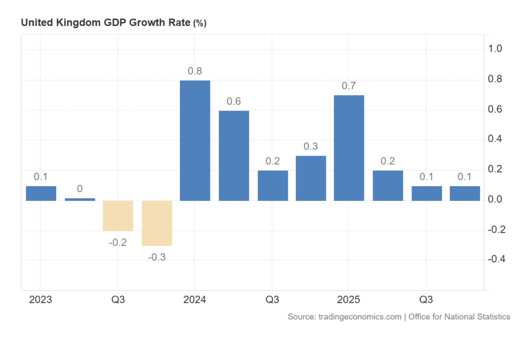PDB Inggris tumbuh 0,1% dalam tiga bulan terakhir hingga Desember tahun 2025, sesuai dengan ekspektasi menyusul pertumbuhan 0,1% pada kuartal ketiga tahun yang sama.